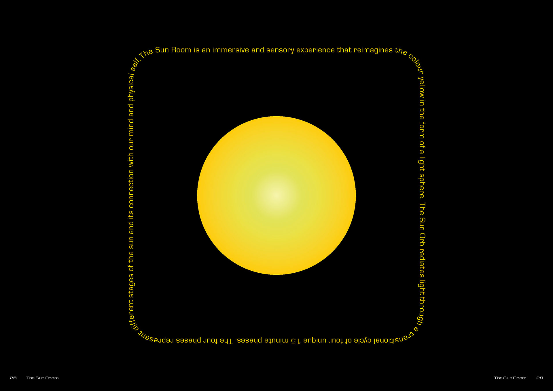 The Sun Room is an immersive, sensory experience that reimagines the colour yellow through a radiant light sphere. The Sun Orb progresses through a 1 hour cycle of four distinct 15-minute phases, each reflecting a different stage of the sun and its connection to mind and body.